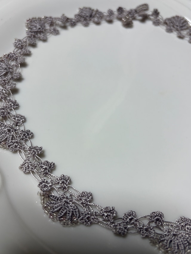1点もの。 ちょっと編み方が複雑らしく、直ぐには編めないようです(汗) ローズピンクにブルーグレイの光沢があるビーズを編みこんで。 まるでレースの様なオヤのネックレス♡ 留め具部分は長さが3段階に調節できるように編んであります。 もちろん、オヤ糸とビーズのみなので金属フリーです。 お洗濯も出来るし、金属アレルギーのある方にも安心ですね♡ 糸:ポリエステル ビーズ:ガラス 長さ:約49㎝(留め具部分含む)