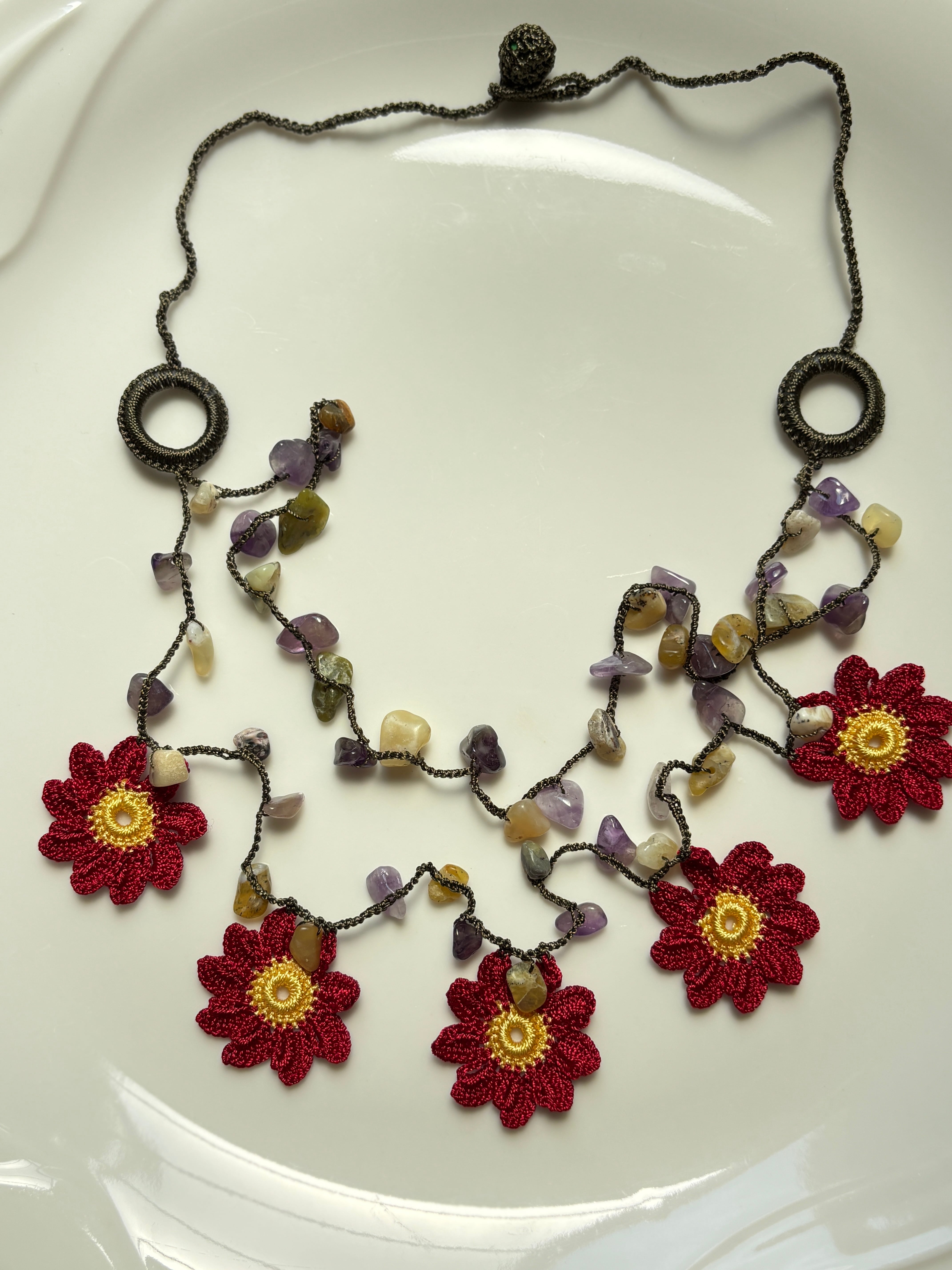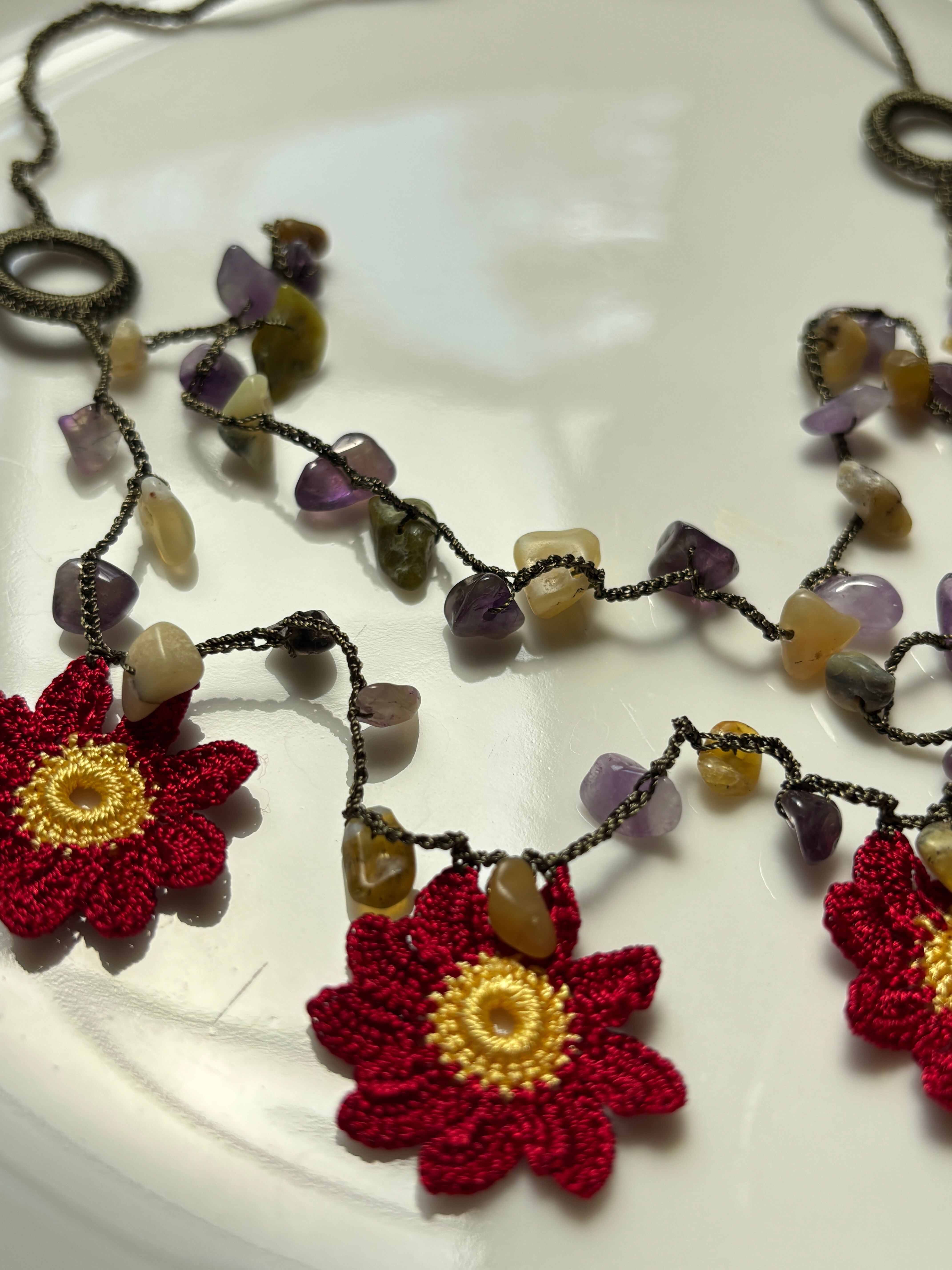 5輪の美しい赤いダリアの花が、アメジストなどの細石と共に編み込まれた「赤いダリアのネックレス」。この特別なネックレスは、あなたのコーディネートに華やかなアクセントを加え、見る人を惹きつけること間違いなしです!軽やかでありながら存在感のあるデザインは、普段使いから特別なシーンまで様々な場面で活躍します♡