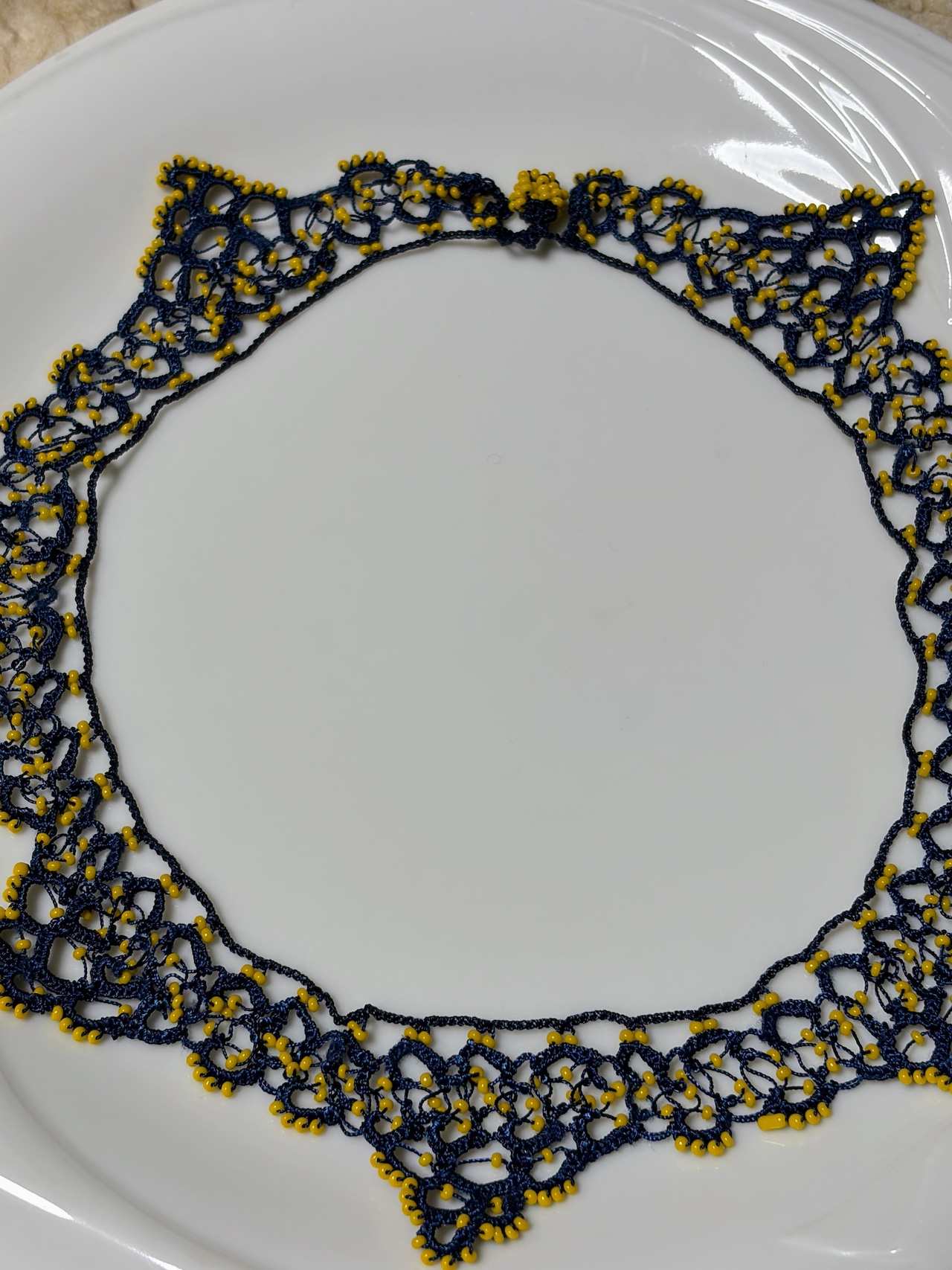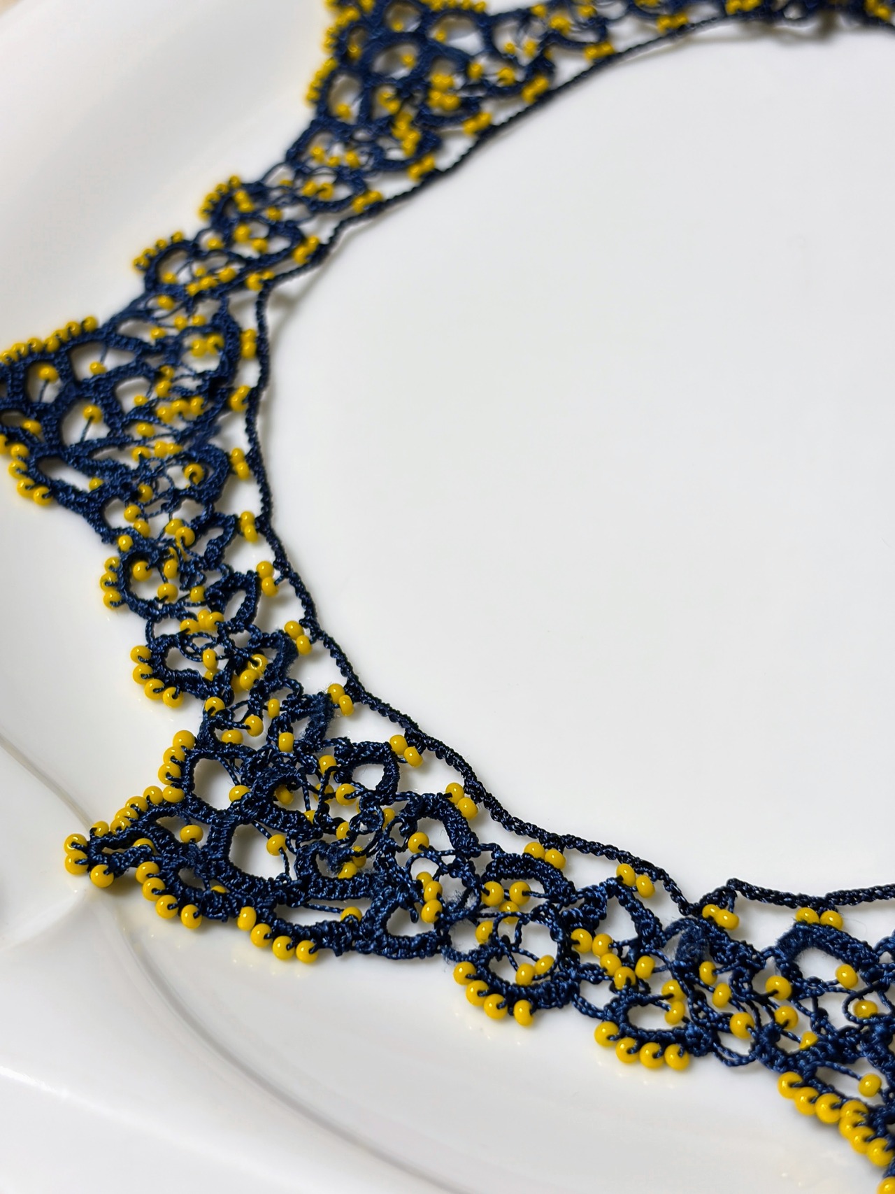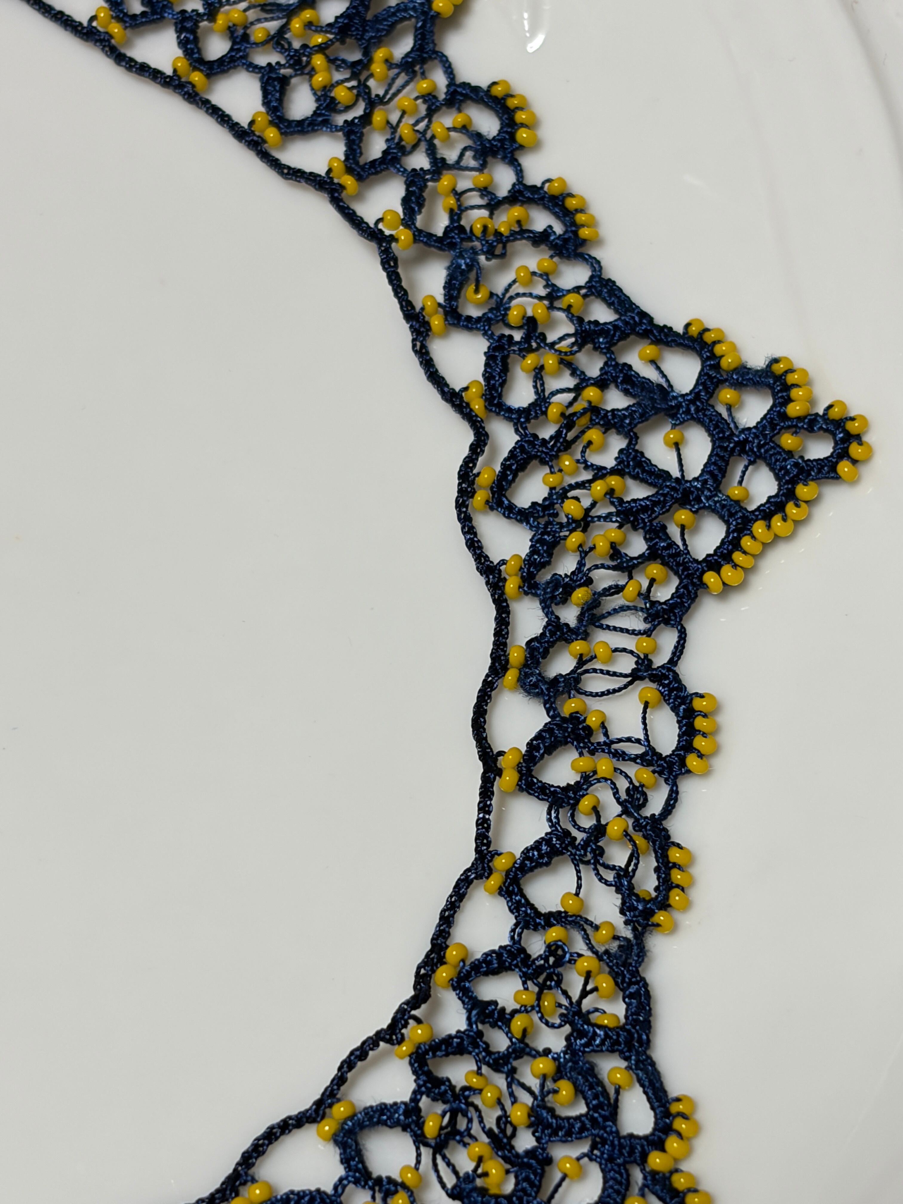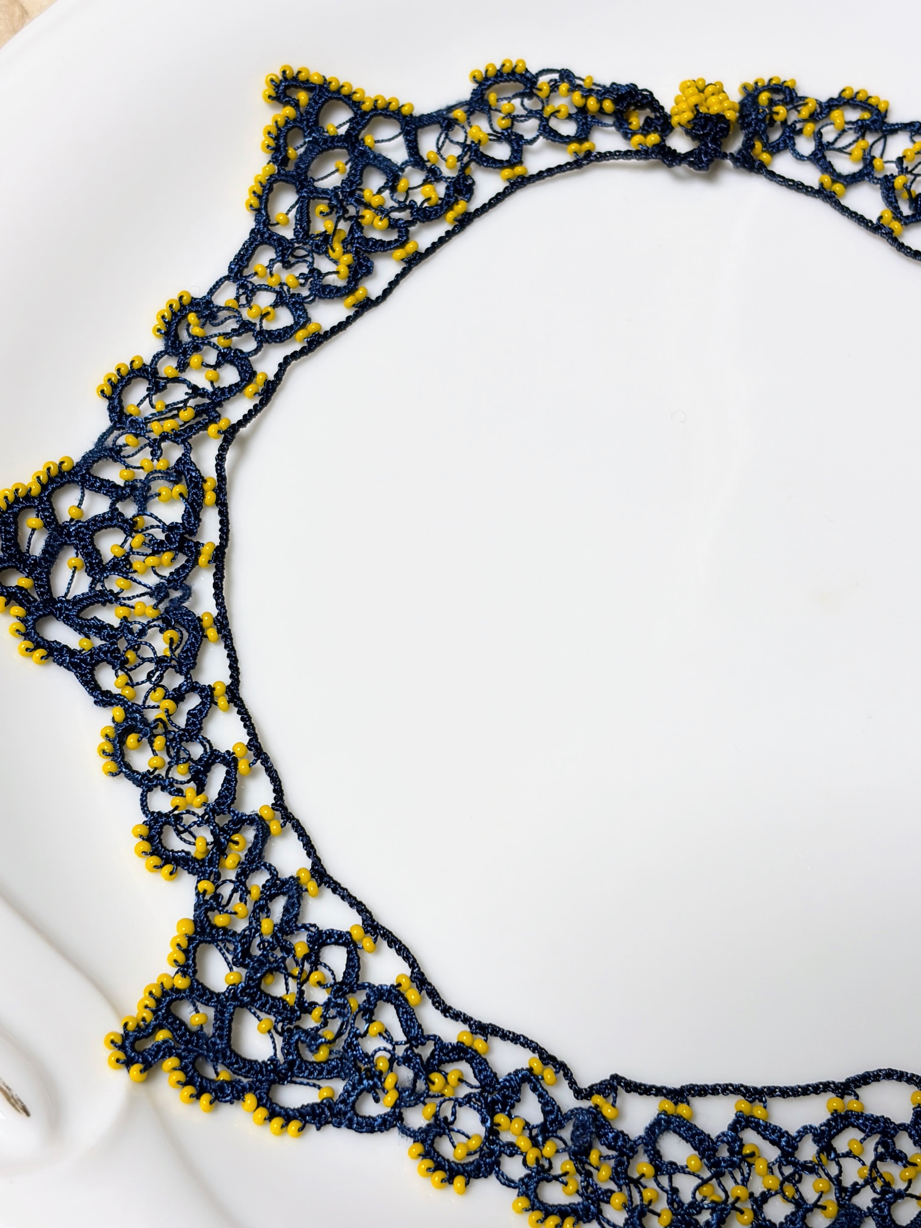 「ビーズをたっぷり編み込んで 一点もの」は、ネイビーの糸で丁寧に編まれたネックレスです。辛子色のビーズが個性的に彩り、繊細さとゴージャスさを兼ね備えた美しいデザインが特徴です!特別な日のコーディネートにぴったりの一品で、あなたの魅力を一層引き立ててくれることでしょう♡