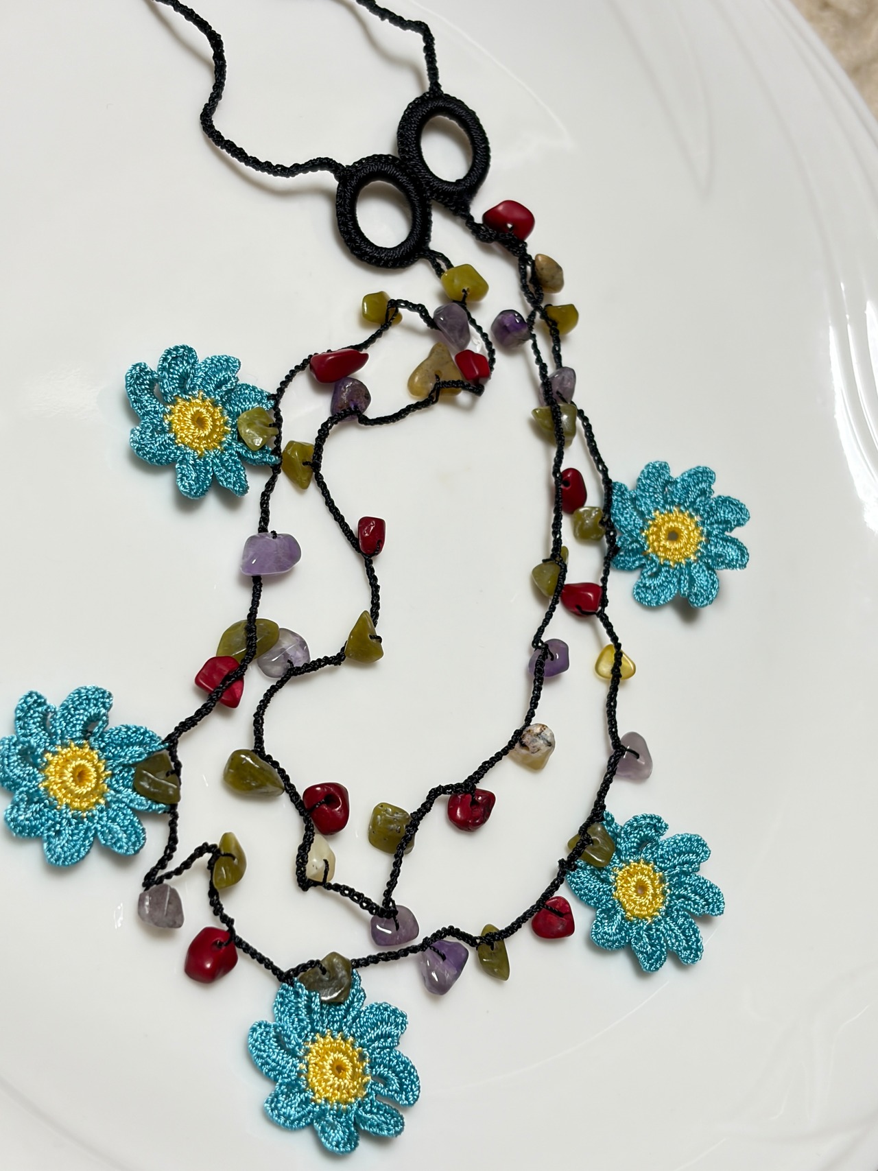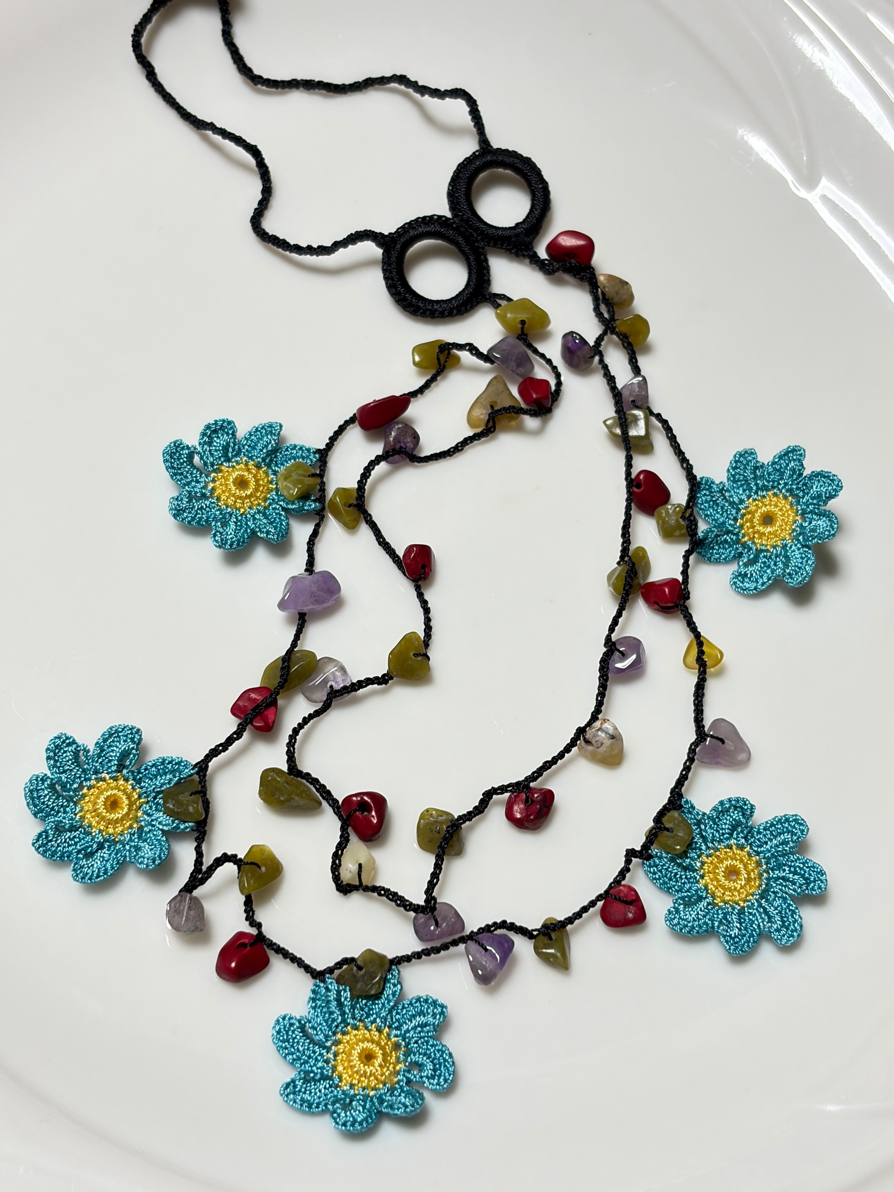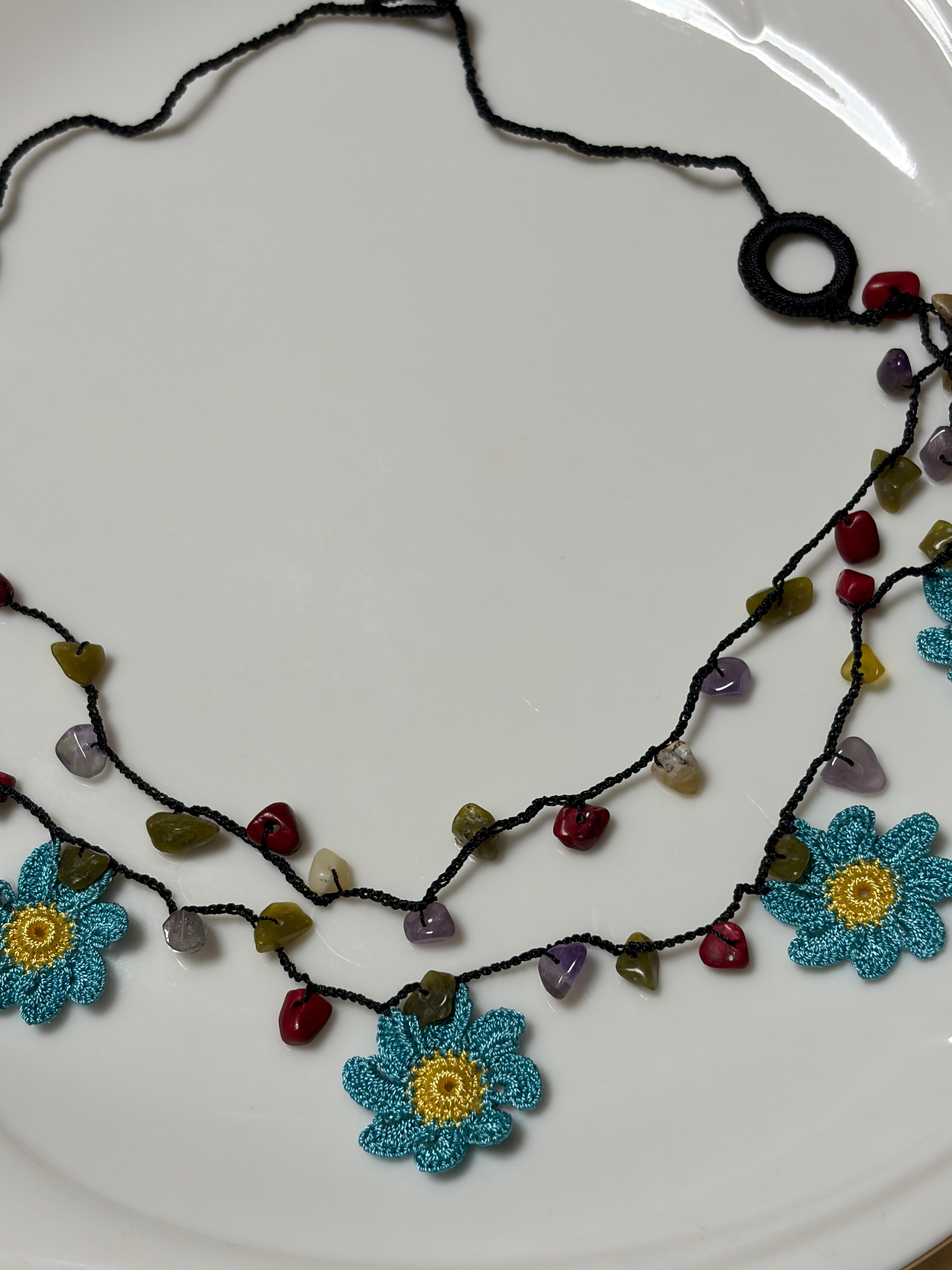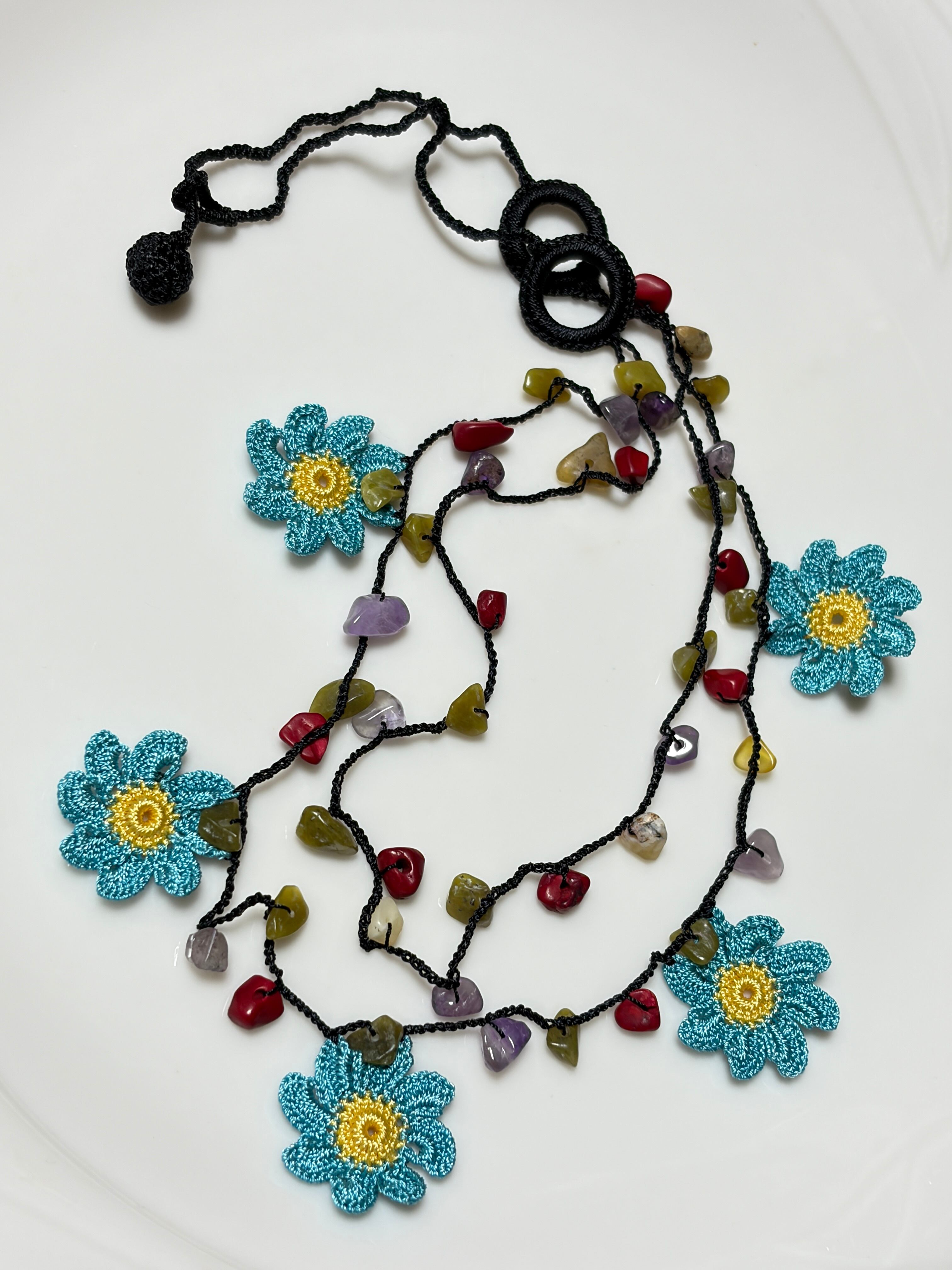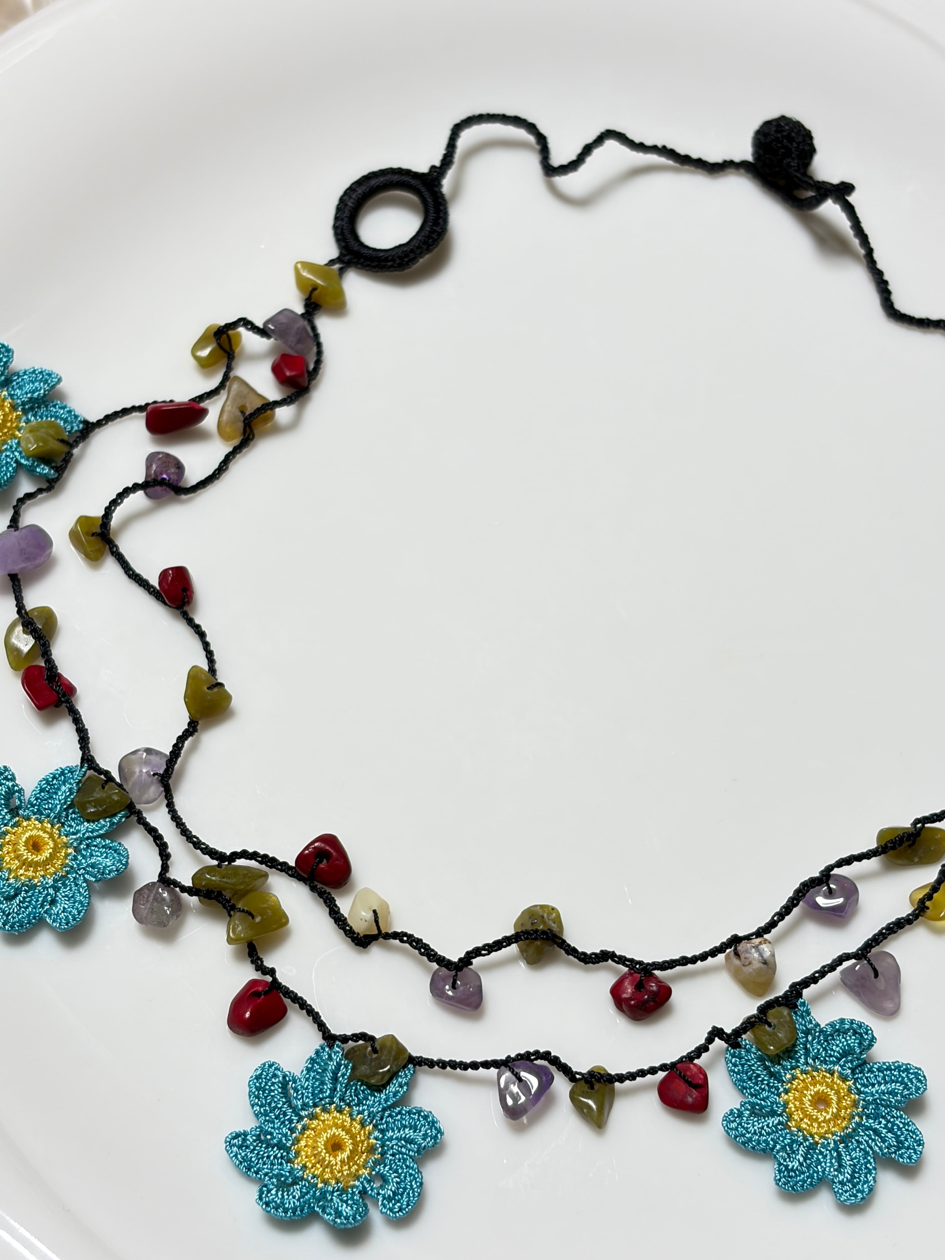 「ブルーのダリア」は、可憐な花のモチーフと天然石ビーズをあしらったおしゃれなアイテムです。美しいブルーの色合いが特徴で、一部が2連になっているデザインが魅力を引き立てます!留め具がなく、かぶるだけで手軽にお使いいただけるため、忙しい日常にもぴったりです♡