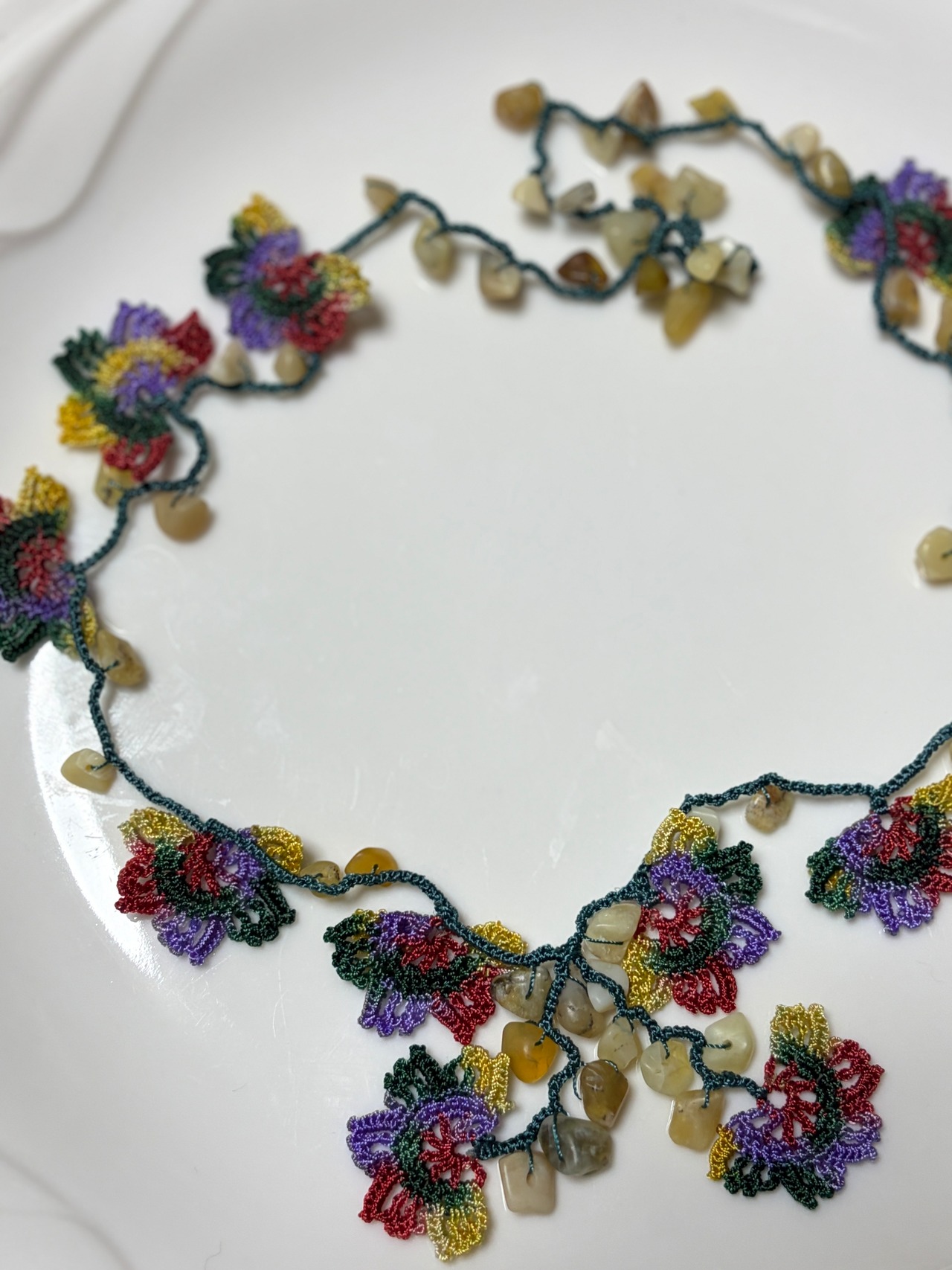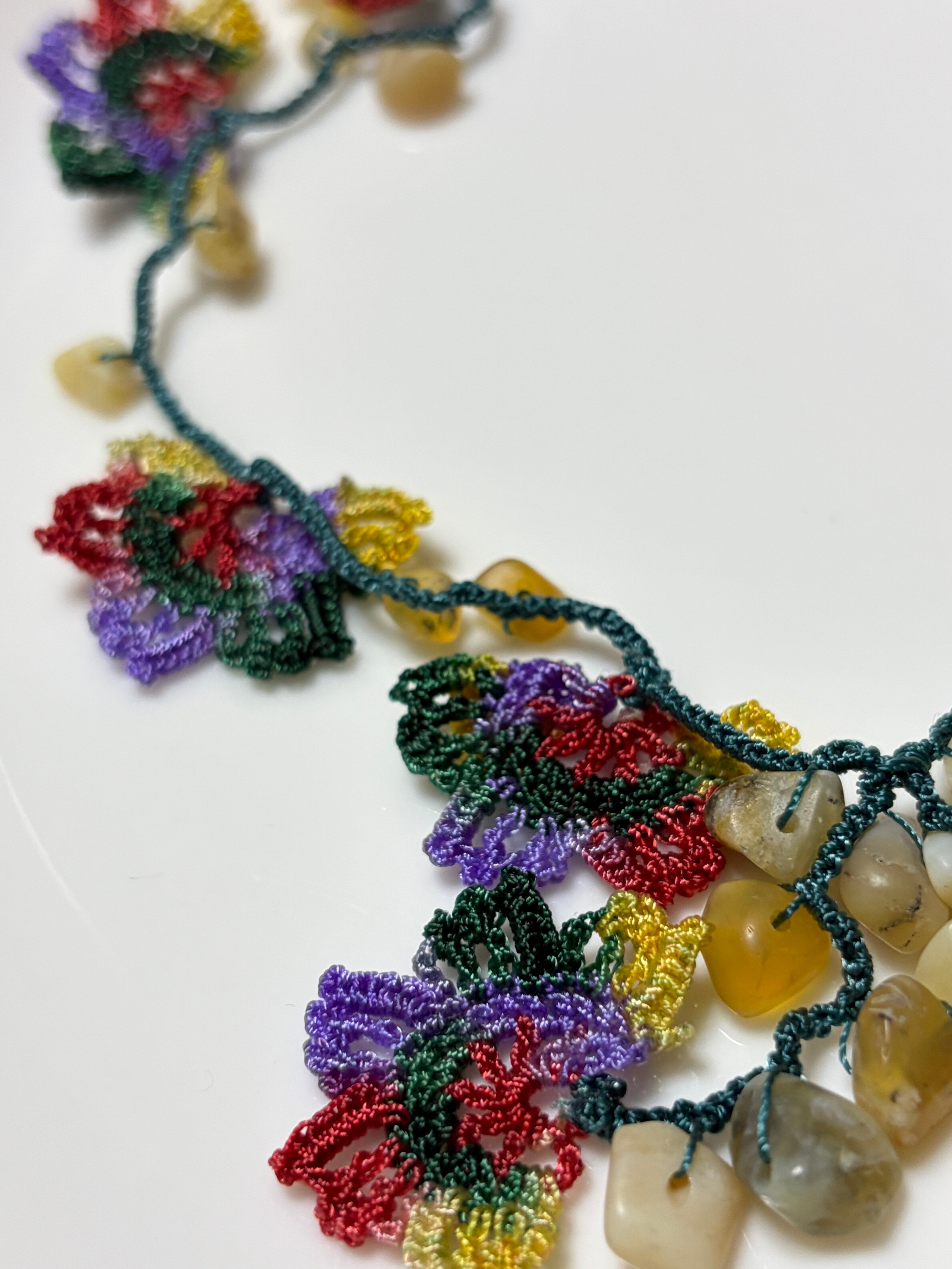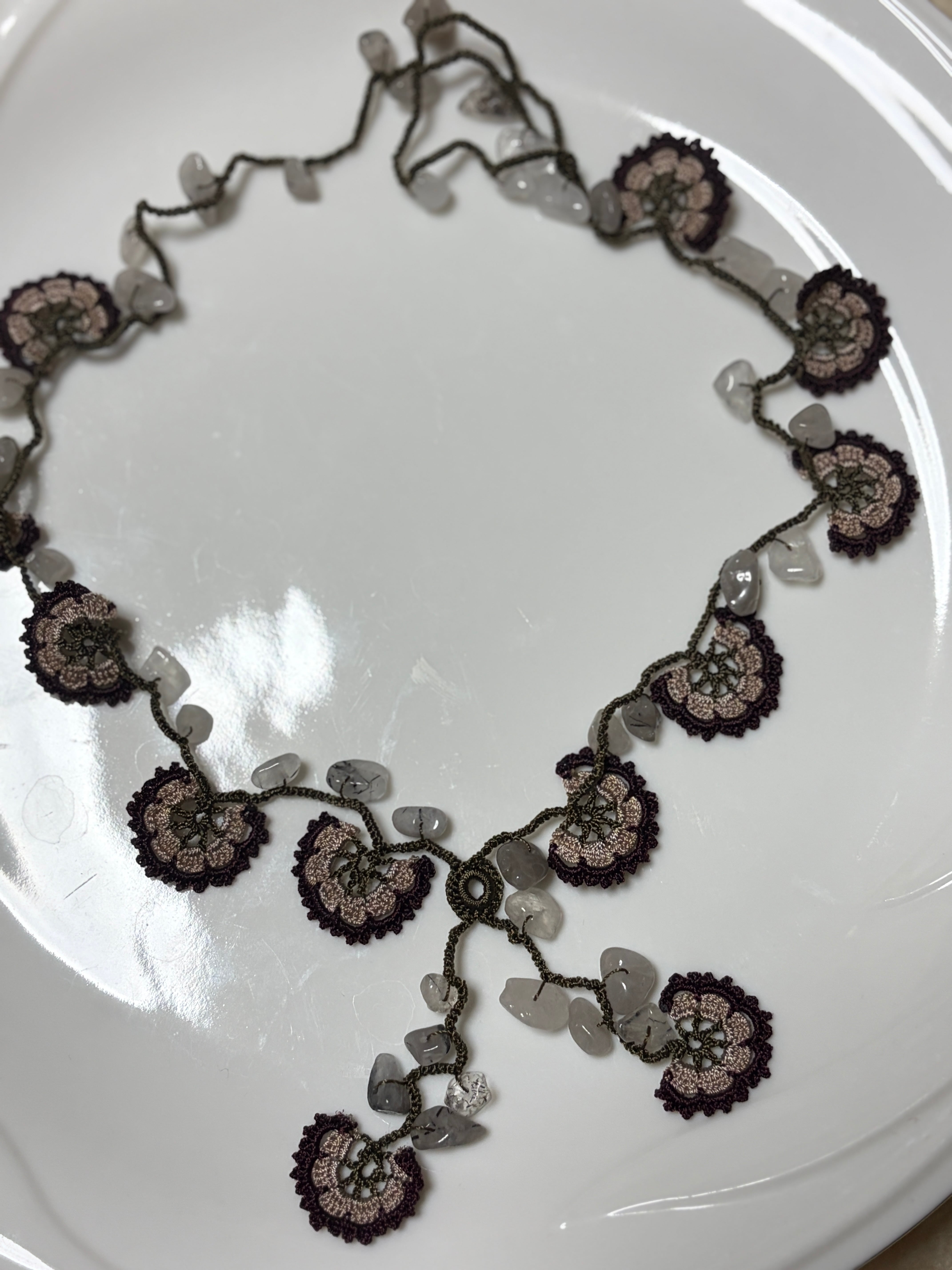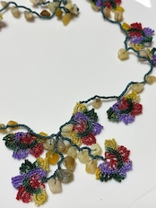 「花のモチーフと天然石を編みこんで」は、花のモチーフが魅力的なネックレスで、天然石が美しいアクセントを加えています。留め具がなく、かぶるだけで簡単にお使いいただけるため、いつでも手軽にオシャレを楽しめます♡