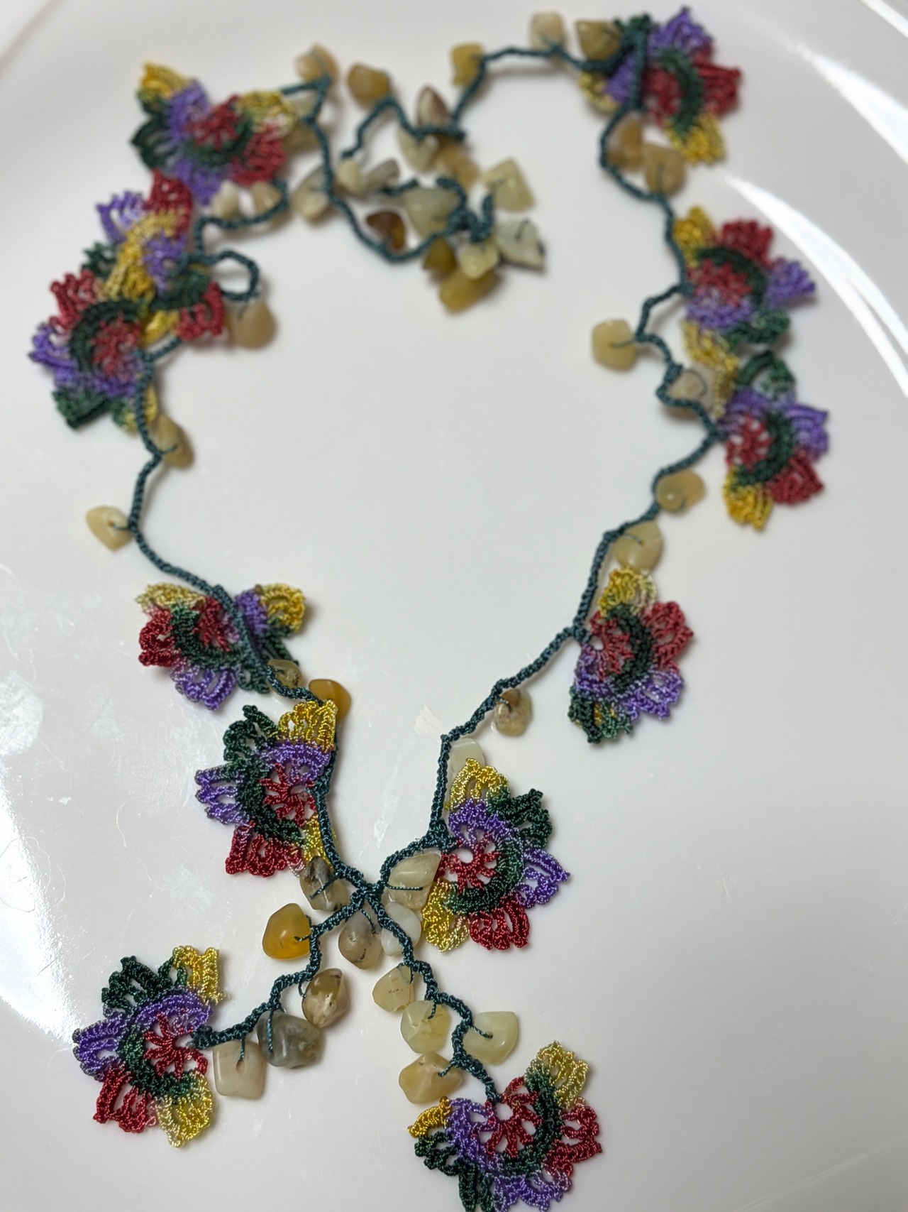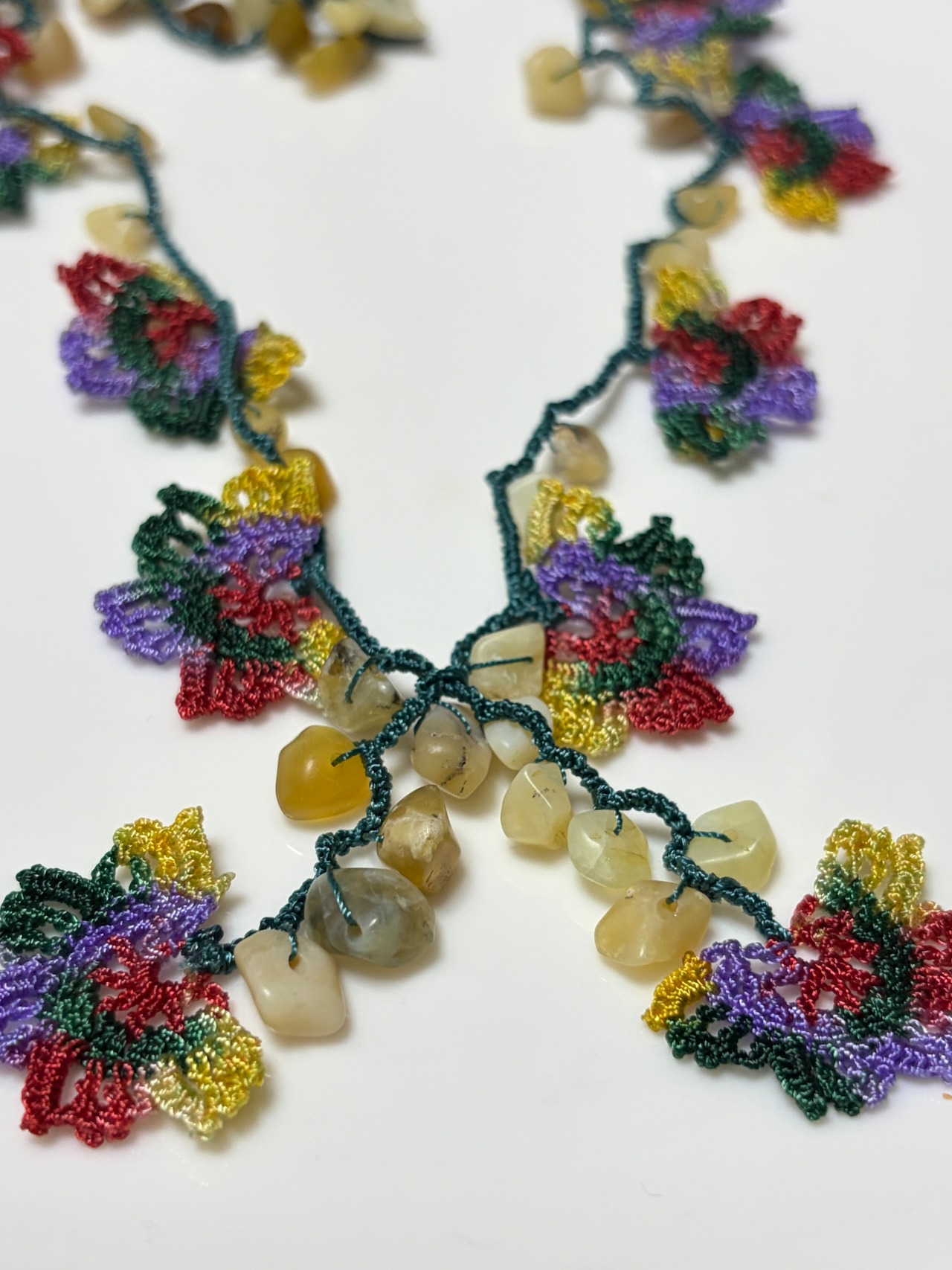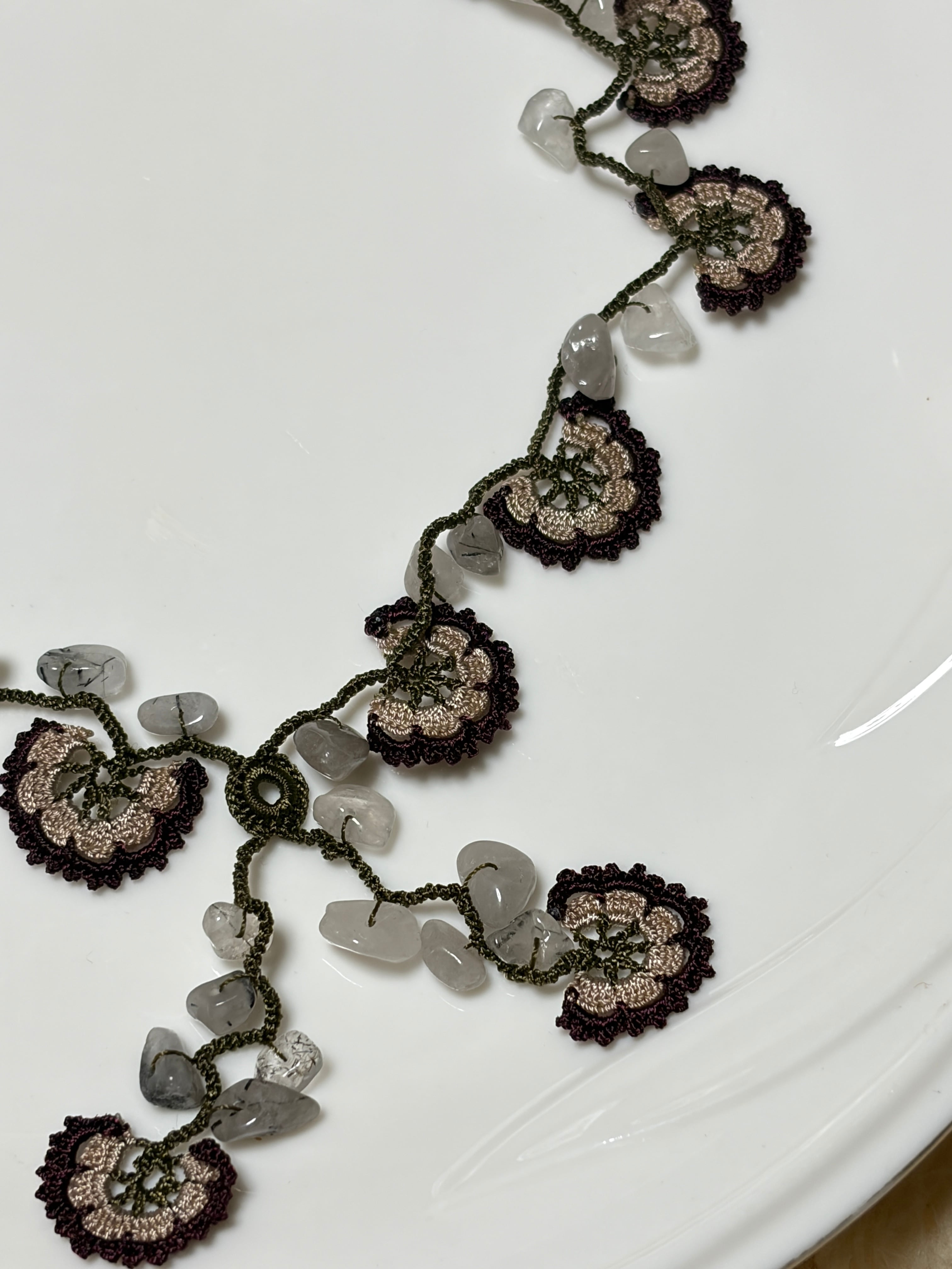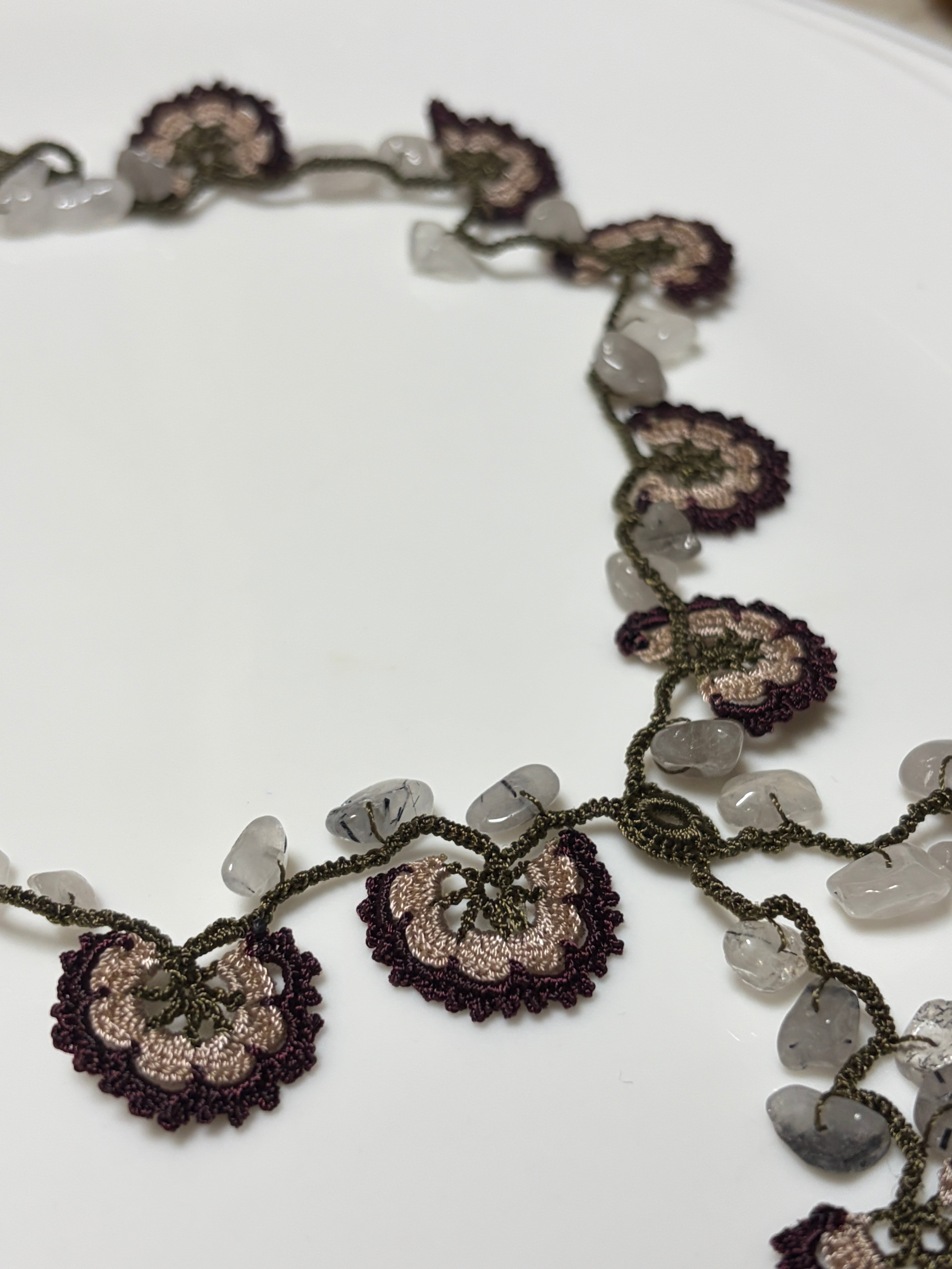 「花のモチーフと天然石を編みこんで」は、花のモチーフが魅力的なネックレスで、天然石が美しいアクセントを加えています。留め具がなく、かぶるだけで簡単にお使いいただけるため、いつでも手軽にオシャレを楽しめます♡
