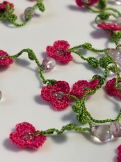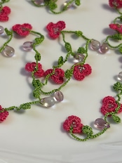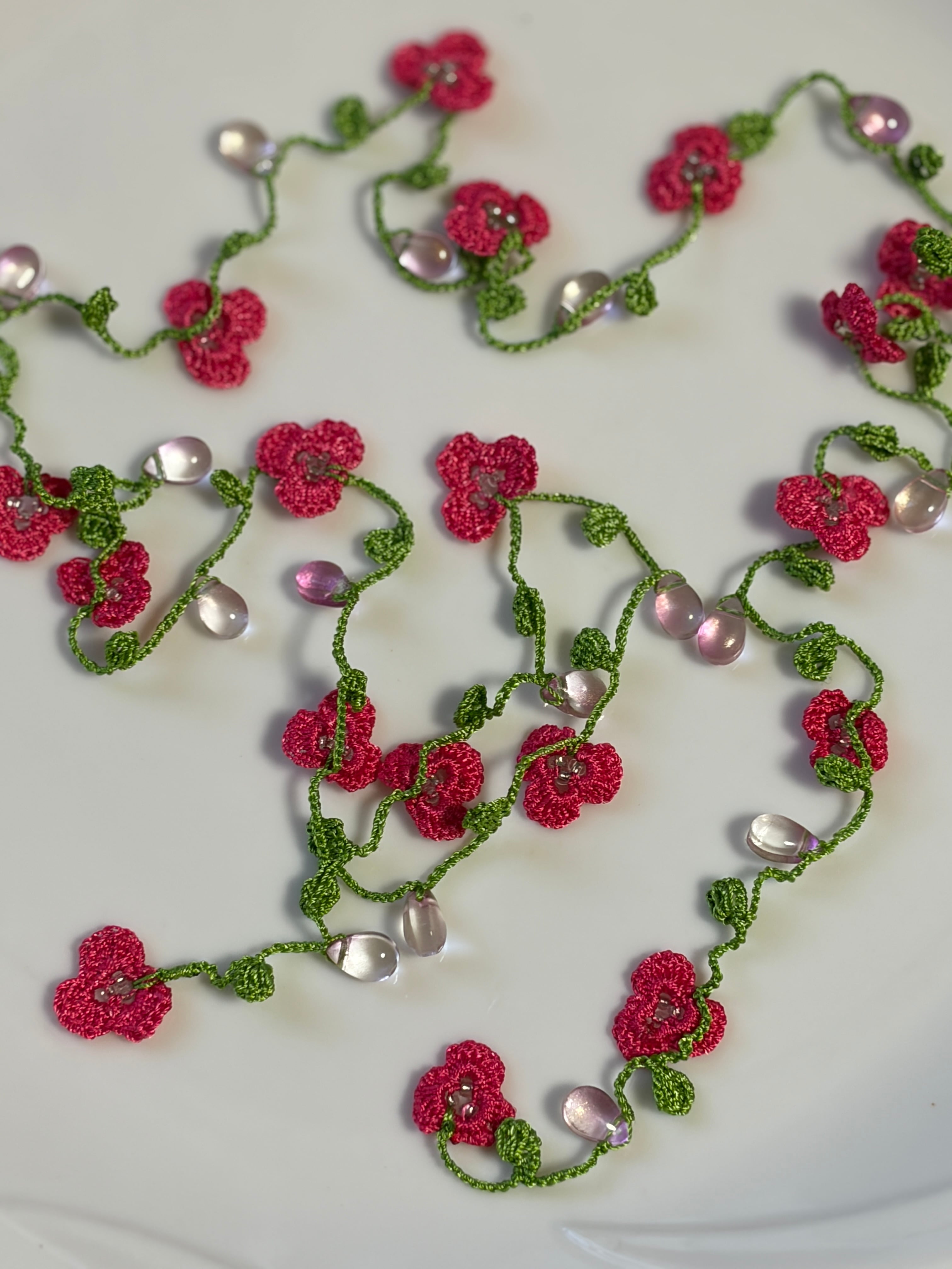 お花畑のイメージが込められたこのラリエットは、様々なアレンジができるので、特別な日のおしゃれにはもちろん、普段使いにもピッタリで、どんなスタイルにもマッチします。手作りの温もりを感じ、身につけることで心まで華やかにしてくれることでしょう。