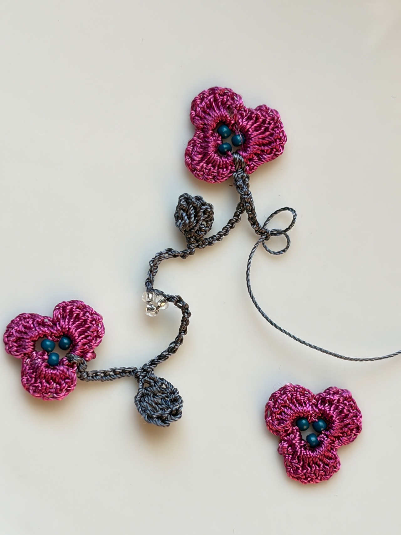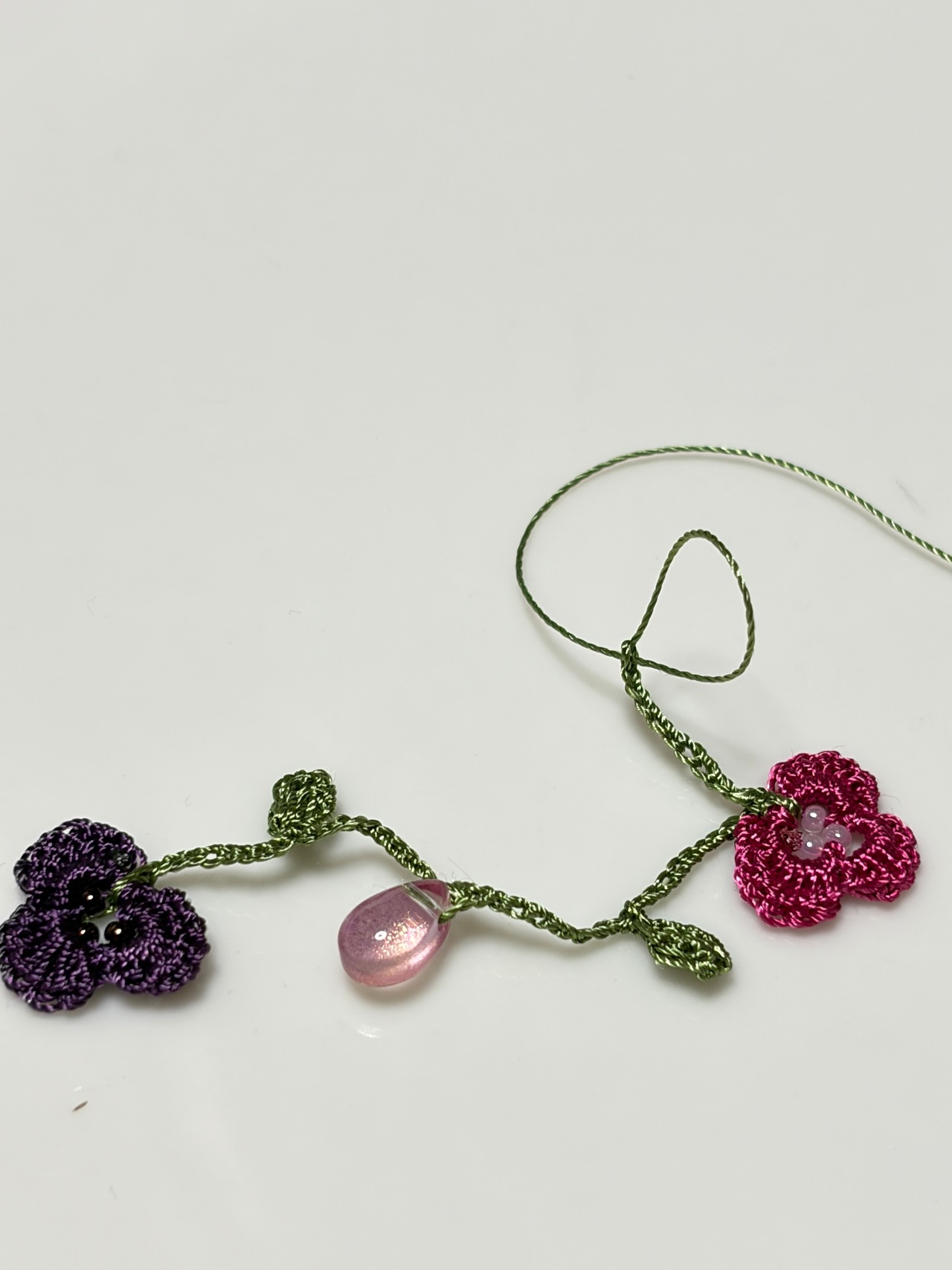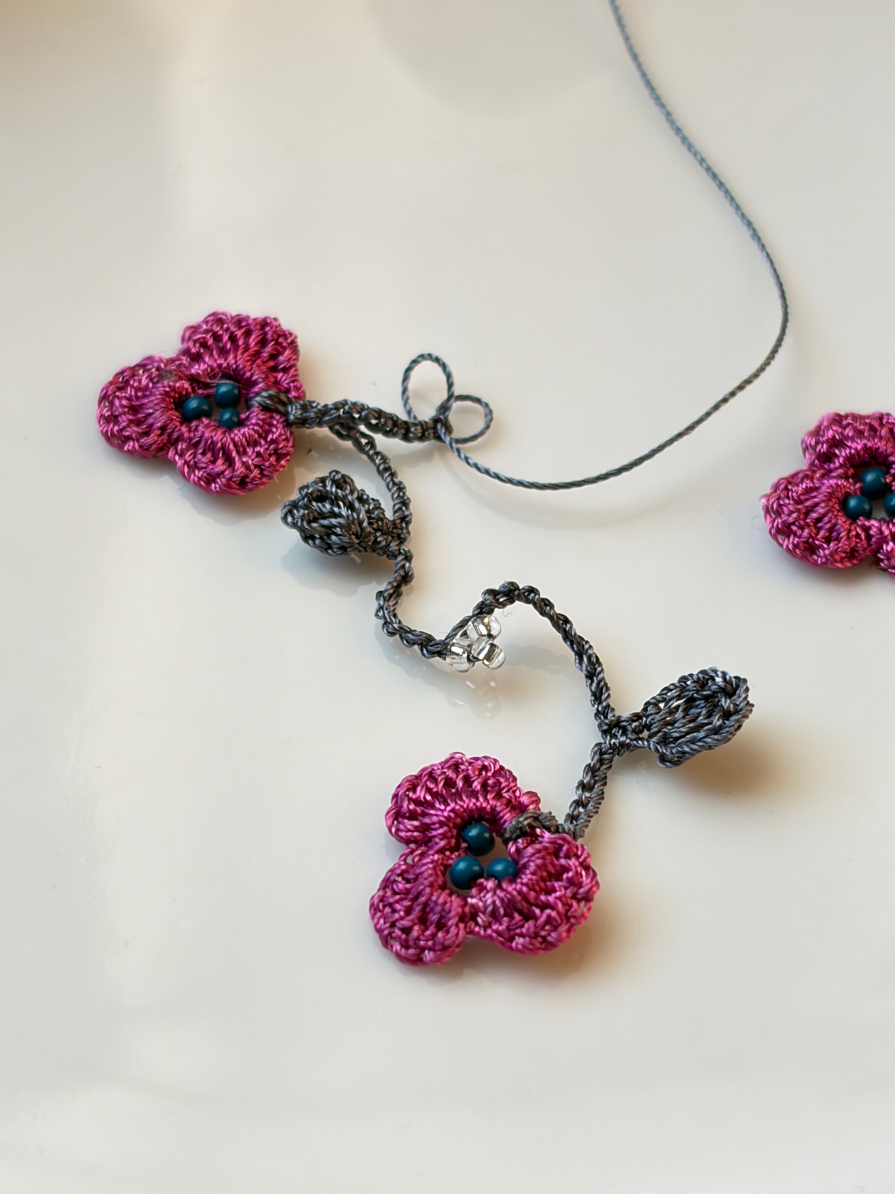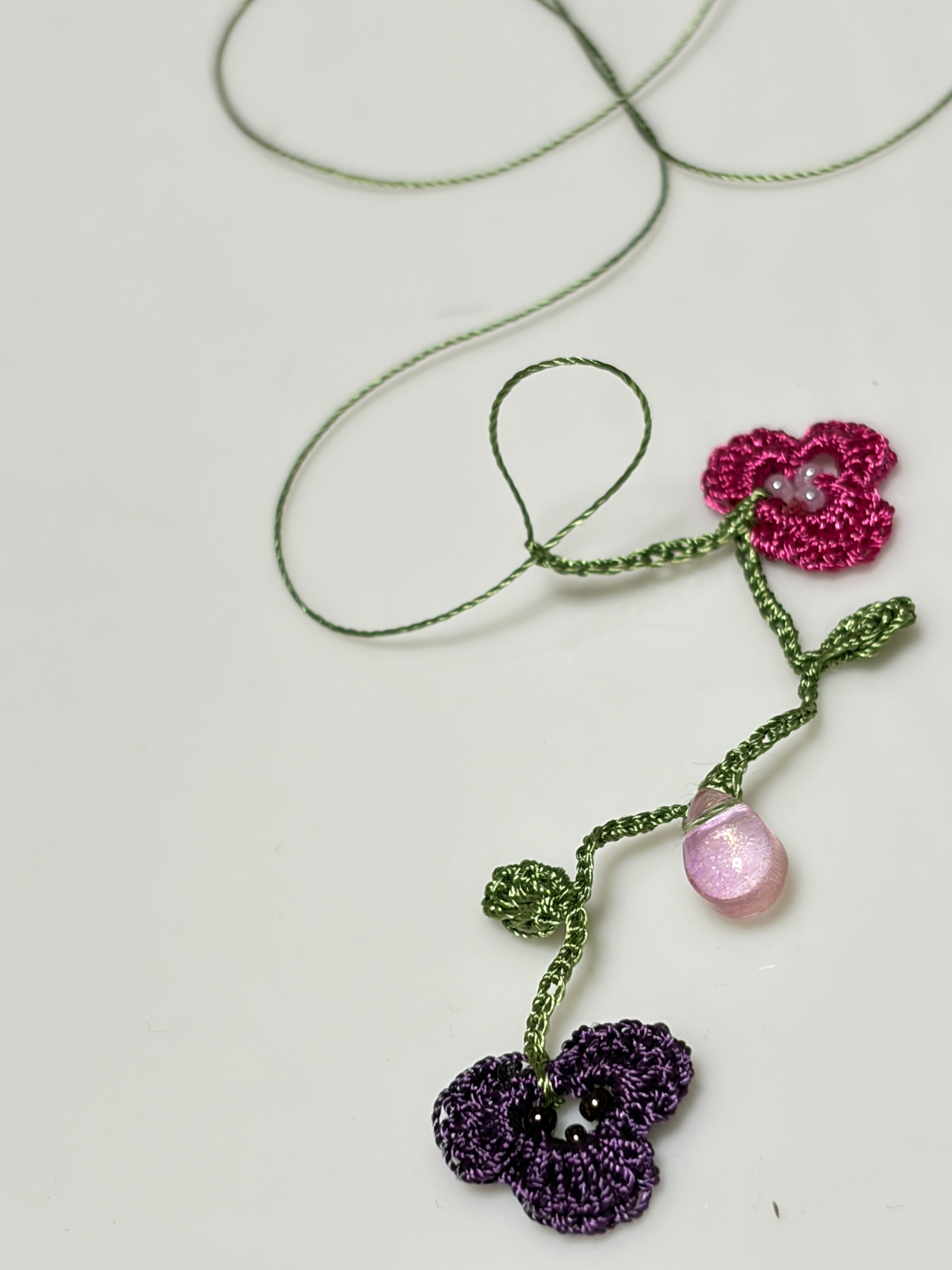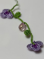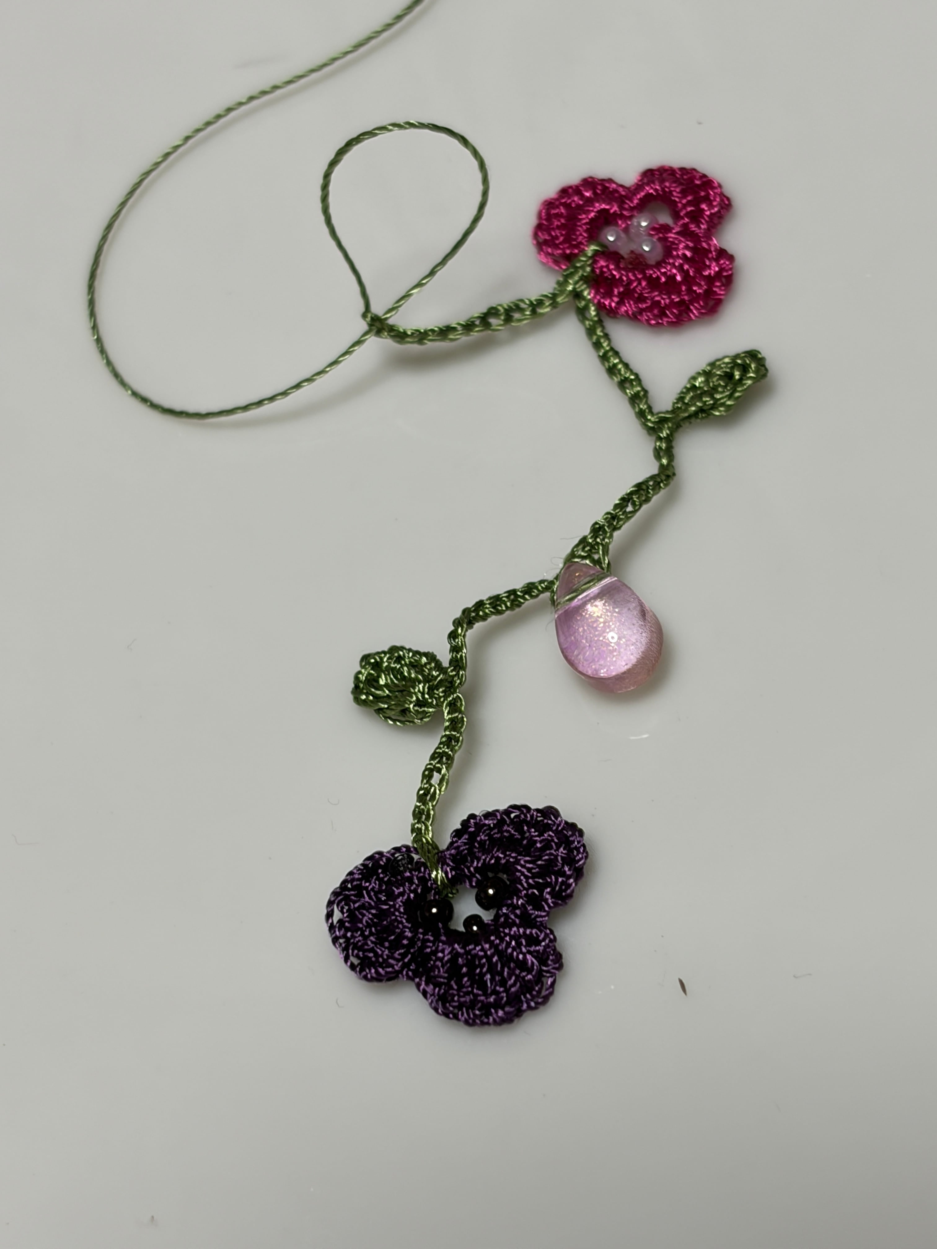 手仕事で丁寧に編み込まれた「アレンジ自在♪ すみれのお花畑のラリエット」は、可憐なすみれの花のモチーフがたっぷりと施された華やかなアクセサリーです。身につけることで、あなたのコーディネートに一層の彩りを加え、優雅さを引き立てます。